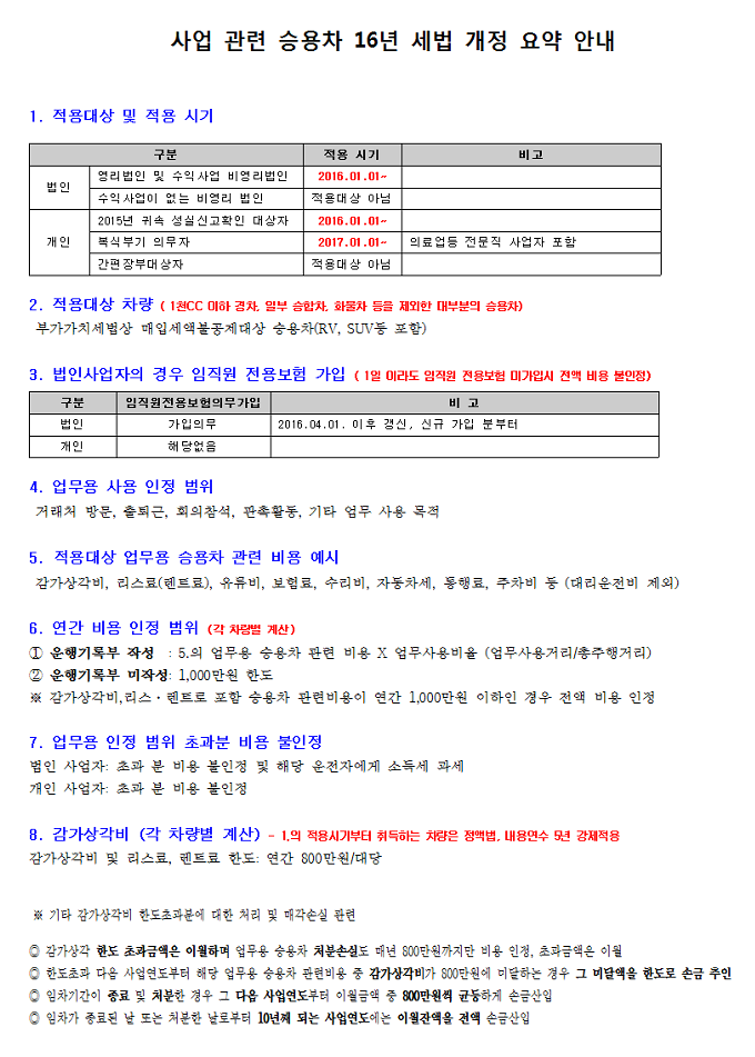 사업관련 업무용 승용차의 16년 세법개정안내